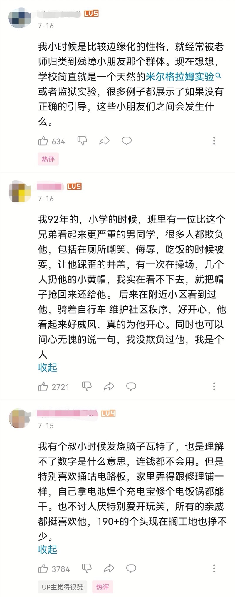 这条视频发布一周内登上了全站热门榜,评论区成了许多人的回忆树洞,有人分享了自己亲身经历或目睹过的校园暴力,也有人讲述着身边残障人士的生活。