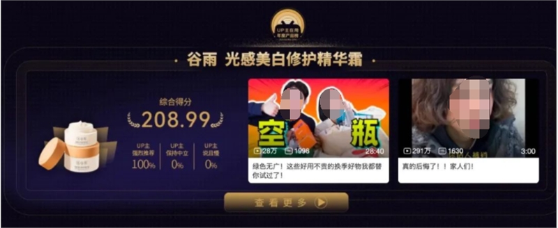 美妆个护品类排名第一的珀莱雅,是近年成功实现品牌焕新的“国货之光”,排名第二的谷雨则是又一次登上了榜单,今年上榜的美白修护精华霜得到了100%的UP主在赞。彩棠、颐莲、毛戈平、至本的相关产品,在UP主的使用中各显奇效,要么在精通“换头术”的UP主手里变成明星仿妆,要么在UP的使用推荐中成为大学校园的必备单品。