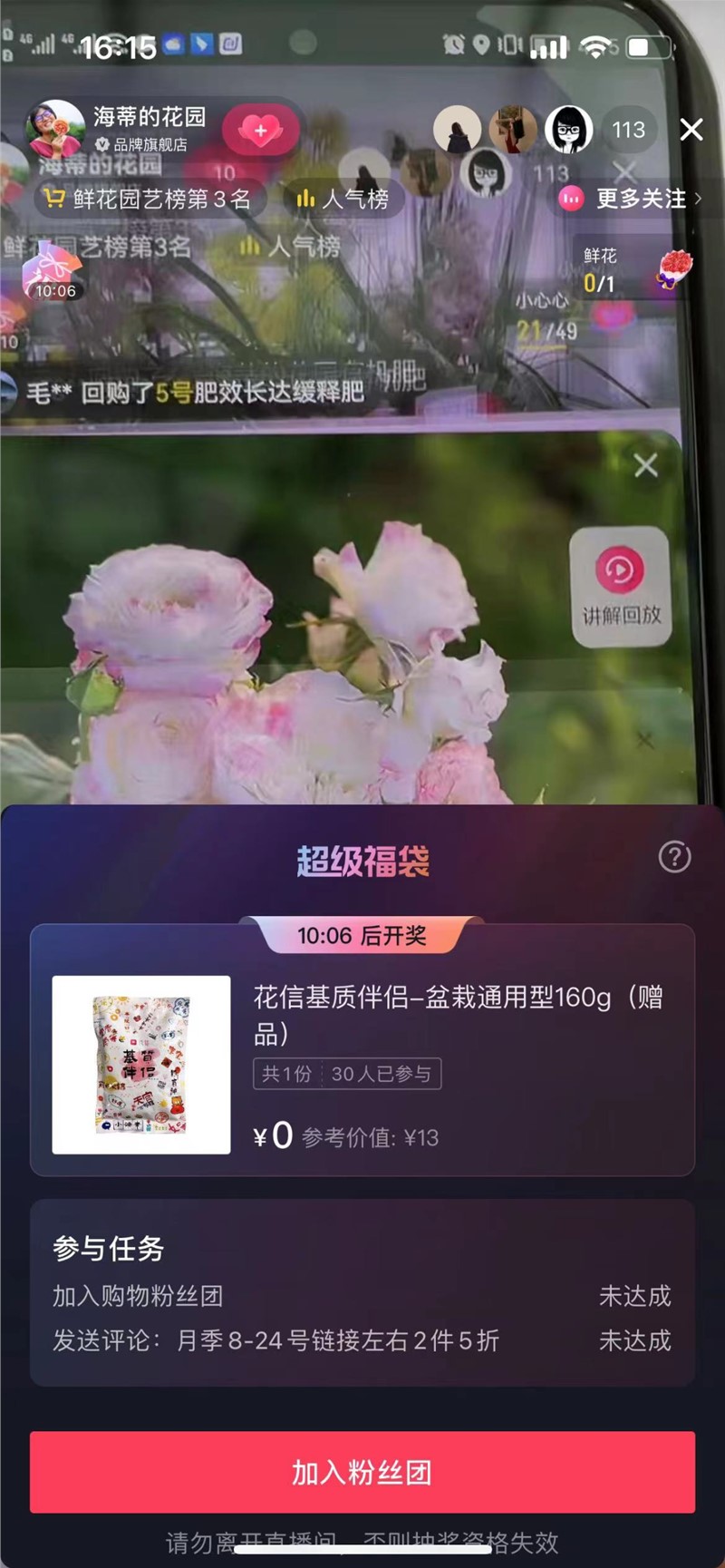 且福袋的门槛并非只能设置一个,例如在海蒂的花园直播间,福袋门槛就是加入粉丝团+评论。