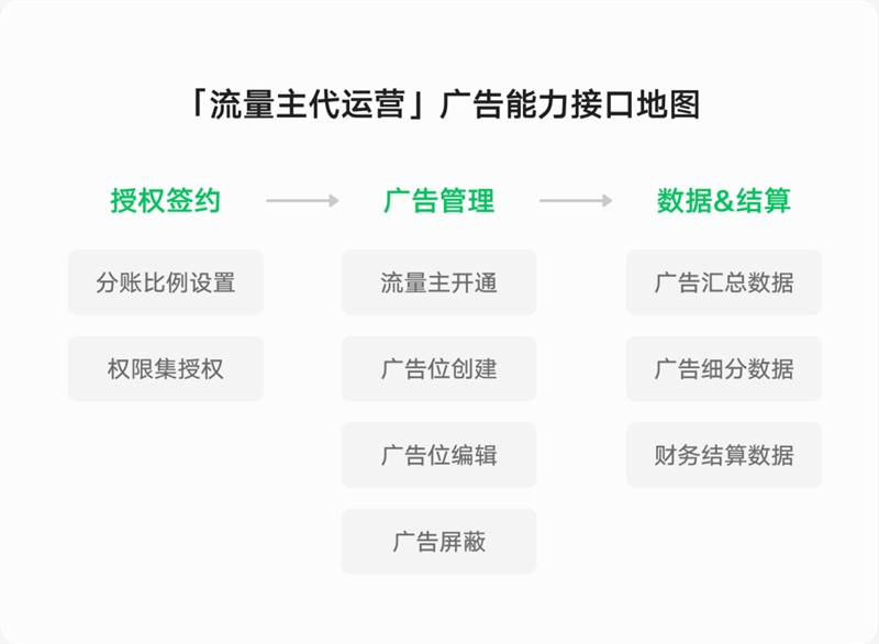 对齐独立开发小程序成熟广告变现能力,结合服务商使用习惯,平台将核心能力接口化,支持广告上线全流程接口化实现,能力全面且操作简单。