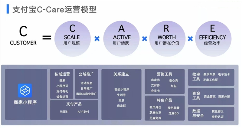 两个“1”分别是一个流量激励政策-繁星计划、一个商家运营C-care模型。商家可通过繁星计划来获取免费的公域流量曝光,同时通过C-care模型将平台的公域流量获取沉淀至私域小程序,带来相应转化和留存。《2022支付宝助力实体年度报告》数据显示,“繁星计划”平均每天为商家私域小程序带去100万用户。