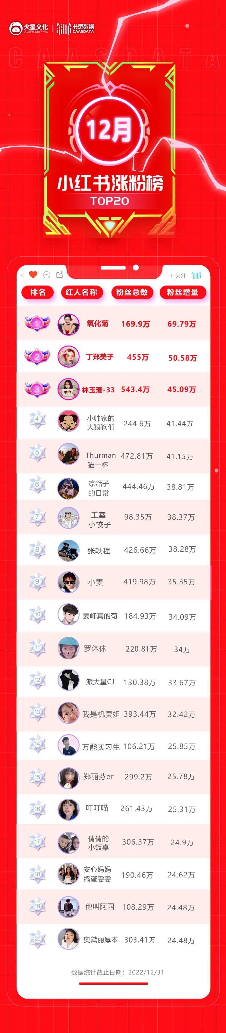 排在首位的依然是变装博主@氧化菊,继上月领跑后,又以69.79W的涨粉数遥遥领先;第二名@丁郑美子在过去一年中也多次上榜,但这次50.58W的涨粉数无疑让人更加惊喜;排在第三位的@林玉珊-33在12月也维持了自己的涨粉水平,收获了45.09W新粉丝的关注。