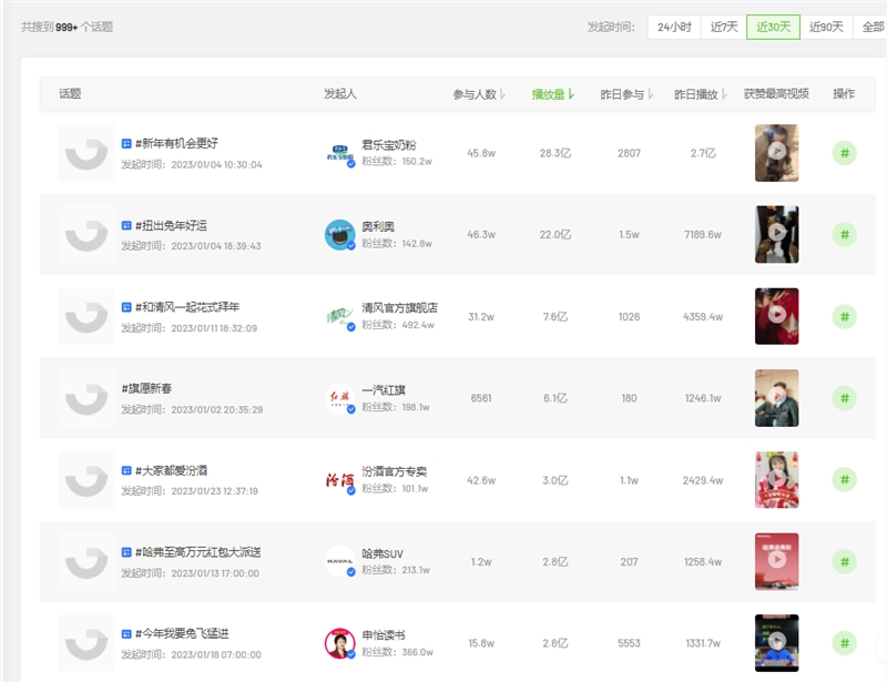 从飞瓜热门话题榜可以看到,品牌近期的话题都紧靠新年主题相关,多个话题参与人数突破40w+,带来20亿+播放量。品牌话题多从新年期许、过年氛围切入,让抖音用户在参与话题活动的同时,也能自发创作新年主题内容,产出丰富的高质量短视频。