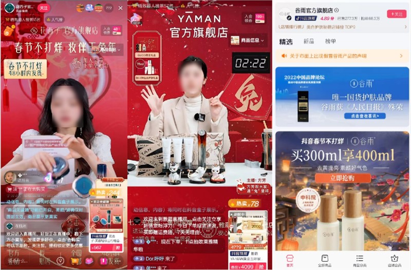 从美妆品类来看,许多品牌官方直播间在正月期间持续自播。直播间装饰多以“中国红”及相关元素为主。「花西子」直播间在醒目位置标注“春节不打烊、妆伴玉兔年”的主题,持续陪伴美妆爱好者在新年“美丽出场”。「雅萌」则以“兔”字主题点缀新年气氛,呼吁女生们在新年也要关爱自己,快乐自信。除了直播间的春节氛围心思,品牌在商城、商品装饰上也注重细节。比如「谷雨」在春节期间,专门设计了产品新春主题头图,进一步烘托了温馨热闹的节日气氛。