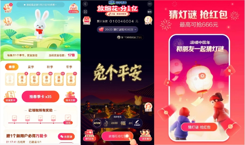 春节期间各大平台的流量竞争激烈,“抢红包”活动也在不断推陈出新。今年抖音的红包玩法加入了更多民俗文化、好友互动等内容,以新技术、新玩法促活,强化了社交属性与品牌电商的链接。