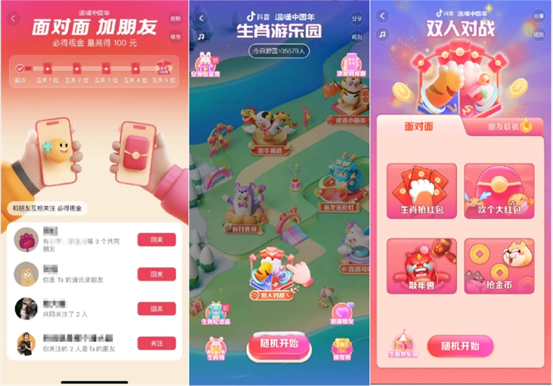 此次春节,抖音丰富的小游戏更是让节日乐趣停不下来。以“生肖游乐园”活动为例,用户可以点击“双人对战”进入页面,同朋友一起玩“生肖抢红包”、“吹个大红包”等游戏。线上线下联合互动,让用户与平台的关系更加紧密。