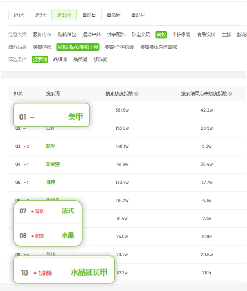 除了传统走亲访友的伴手礼、年货礼盒、特色红包袋等节日用品在抖音商城销售火爆,各类美甲商品与款式也成为抖音热搜词的霸榜得主。从飞瓜商城热词榜可以了解到,“美甲”相关搜索词不仅占据第一位,“法式”、“水晶”等相关类型也出现大幅提升。美甲行业以个性化设计与搭配满足多元用户的需求,越来越多的女生已经习惯定期装饰指甲,行业潜能巨大。