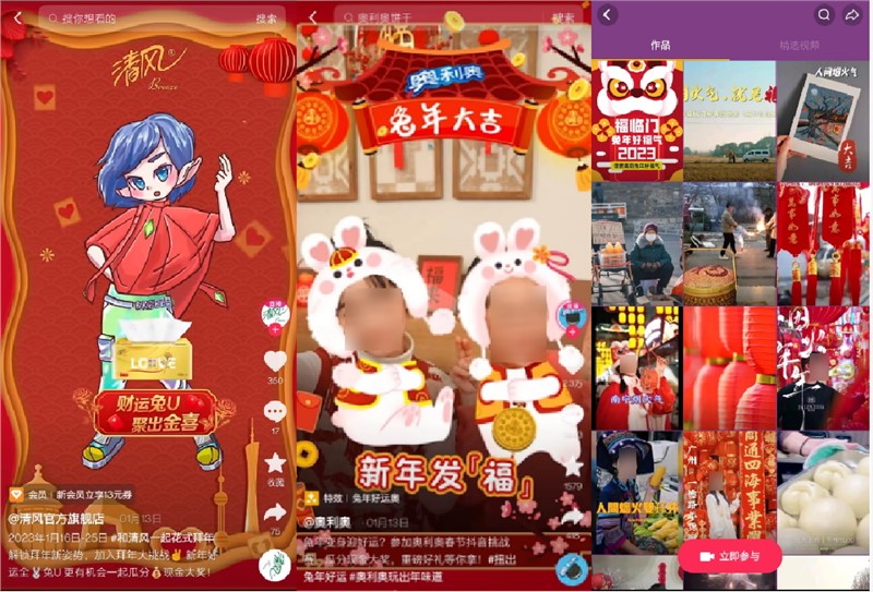 温馨热闹的新春佳节,除了阖家团圆、购置年货,如今参与各个平台互动游戏,也已是过年必备活动之一。2023年,抖音在春节期间也发起了一系列节庆氛围到位的趣味内容。不仅在年前推出了品质好物福利满满的“年货节”,帮助用户一站式选购年货产品,在春节正月期间,也联合多个品牌打造“找红包分4亿”、“春节不打烊”等活动,促进消费回暖。