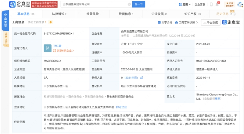 企查查显示,山东强盛集团有限公司成立于2020年1月,法定代表人为孙红雷,注册资本1亿人民币,主营业务中包含水产批发。