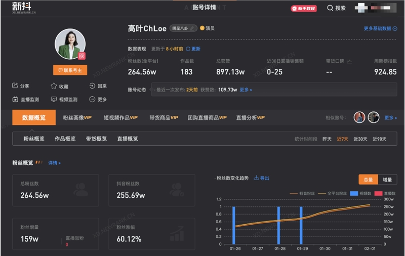 据新抖数据,近7天高叶抖音账号涨粉159万,涨幅达到60.12%,目前总粉丝量为264.56万。