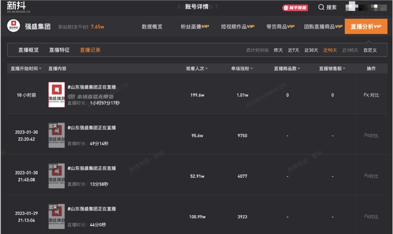 新抖数据显示,该场直播观看人次达到199.6万,也是迄今为止观看量最高的一场直播。截至目前,强盛集团抖音号粉丝量已达到7.7万。