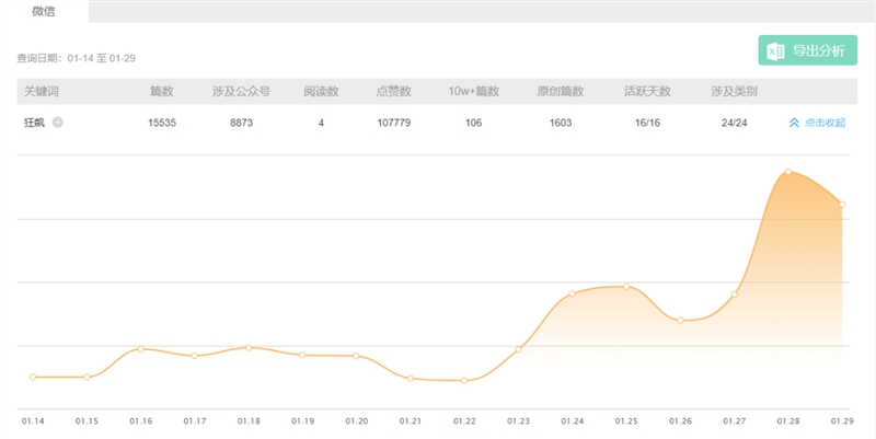 整体来看,自1月14日开播至1月29日,至少有1.5万篇公众号文章提及“狂飙”,其中阅读量10万+的至少106篇。