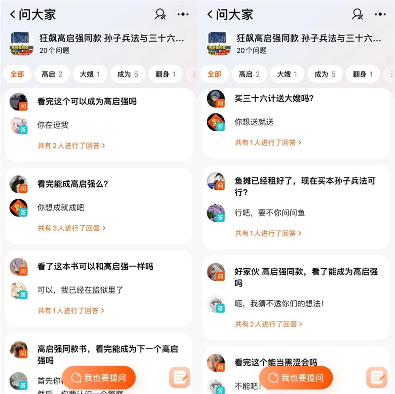 根据《孙子兵法》的淘宝销量排序,前五个商品链接中不乏月销上万的情况,其中有三个已注明预售15天内发货。在买家提问互动区也被《狂飙》剧迷占领,“看完能成为高启强吗”成为出现最频繁的问题。