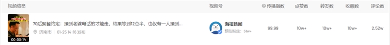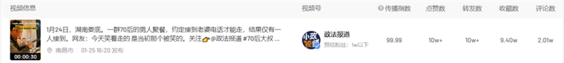 过年当然少不了聚餐,海报新闻、政法报道等媒体账号发布的“70后男人聚餐,接到老婆电话才能走”内容,一样的内容均获得了点赞转发均10W+。