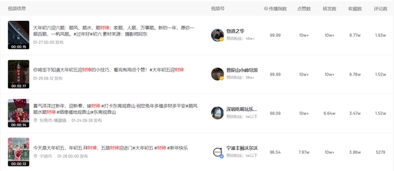 在友望数据中,搜索“财神”可以发现很多迎财神、接财神相关的内容,都获得了10W+的好成绩。