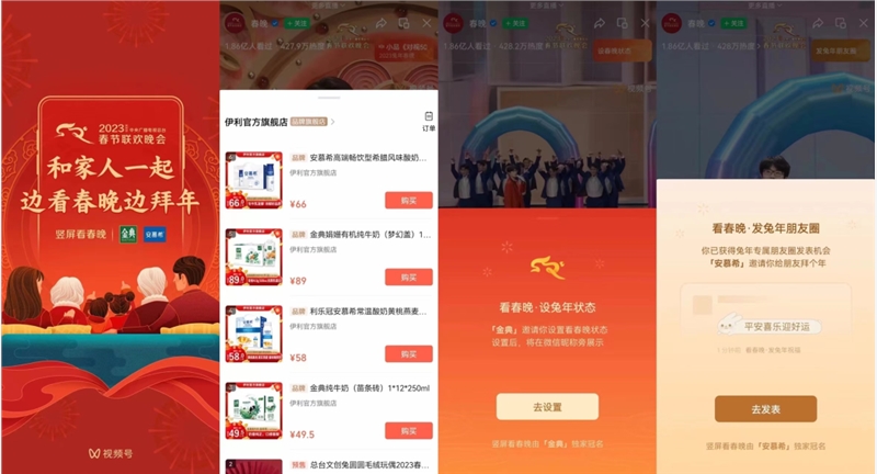 这是视频号与春晚的二度联手,并且首次商业化引入冠名品牌金典、安慕希,在微信生态内探索了多种独特形式和创新玩法,实现优质内容与互动场景的巧妙融合,成功打造春节营销里程碑式大事件。