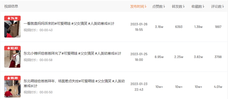 花式拜年的趣味内容,也获得了很多用户的喜欢。比如小糖糖女士的“东北萌娃拜年”,东北话本身就自带笑点,再加上萌娃,以及搞笑的内容,众多爆款因子相结合,就很容易出爆款。其创作的多条拜年视频,有不少都获得了点赞10W+。