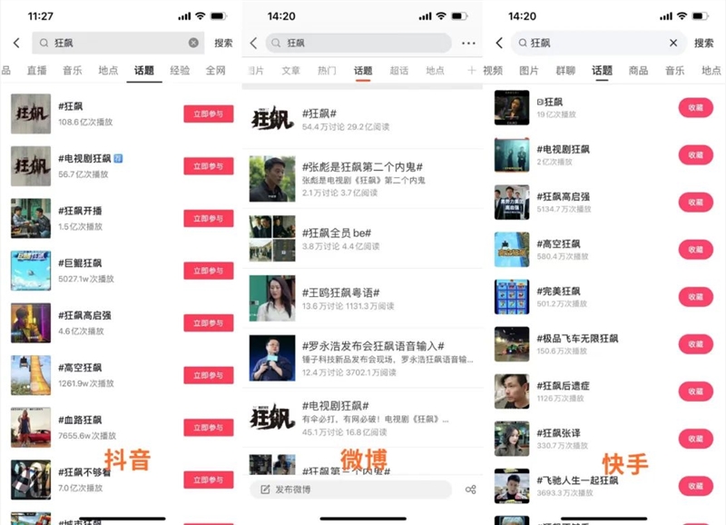 抖音话题#狂飙#获得108.6亿次播放、#电视剧狂飙#获得56.7亿播放,快手话题#狂飙#获得19亿播放,微博话题#狂飙#获得28.8亿阅读、53.6万讨论,小红书有9万+相关笔记,知乎#电视剧狂飙#有1亿浏览......《狂飙》火了,全网百亿流量,谁在分一杯羹?