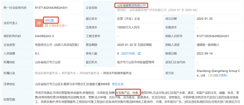 巧合的是,根据企查查了解到,全国有300多家名为强盛集团的企业(与剧中高启强的公司名字一致),其中更是有一家山东的公司主营业务中包含水产批发,与剧情不谋而合(高启强从小鱼贩到大集团),法人代表显示为孙红雷,与演员孙红雷撞名。