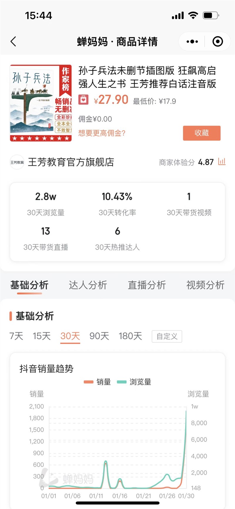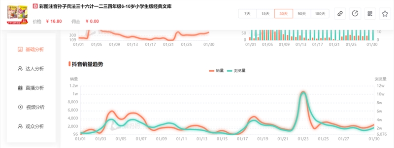 通过蝉妈妈可以看到,《孙子兵法》在春节期间销量快速上升,平时少有人问津的书籍,销量翻了百倍不止。