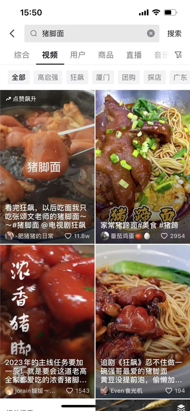 美食达人纷纷发布视频制作猪脚面抢占流量(电视剧中高启强有一段关于猪脚面的故事,并从小吃到大)。
