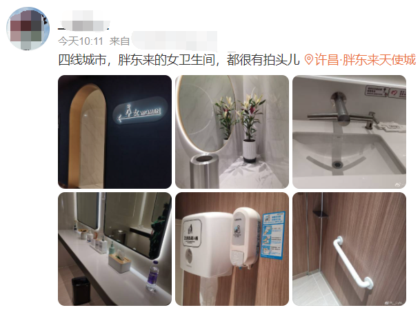 此次在许昌开业的胖东来,就一改常态选择了更高端的形象出现在大众面前,楼层过道中的高端饮水机为那些逛超市的用户提供直饮水,免费提供充电宝,并在卫生间提供戴森的水龙头、洗烘一体机等,同时为用户提供智能静音车库来满足用户的停车需求等。