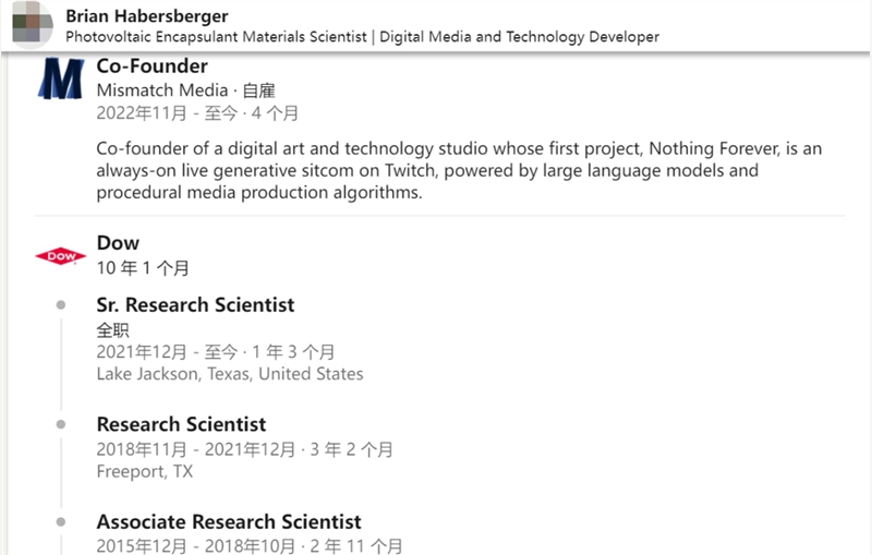 尽管投入了很多,但 Nothing,Forever 并不是二人的主业,Skyler Hartle 在微软任职超过4年,现任高级产品经理,Brian Habersberger 是一位高分子物理学家,根据 LinkedIn 信息,Habersberger 自毕业后就一直在陶氏化学任职,一路做到高级研究员。