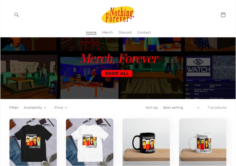 现在除了 Twitch 打赏,Nothing,Forever 还可以通过 Patreon 和卖周边变现。Nothing,Forever 已经迅速推出了自己的周边网站,围绕现在热度较高的 logo 和角色推出了马克杯、卫衣、贴纸等产品。