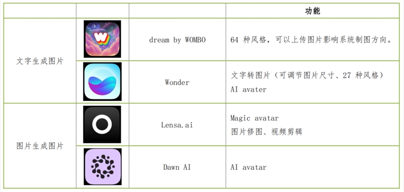 超越这个时间区间,在2022年一整年,有2类 AI 绘图产品分别火了一波。一类是 text-to-photo,输入文字生成图片,代表产品有 dream by WOMBO、Wonder 等,另一类是上传图片生成衍生图片,代表产品有 Lensa.ai 和 Dawn AI 等。