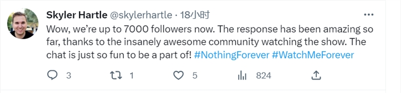 北京时间2月1日晚上10点多,Nothing,Forever 创始人之一 Skyler Hartle 在 Twitter 上发文,庆祝 Nothing,Forever 的 Twitch 频道 WatchMeForever 超过7000个粉丝。笔者2月2日下午去看时,频道粉丝数已经达到3.7万。到了2月6日下午,粉丝数已经超过18万。整体算下来,也是日均新增3万粉丝的水平,而这可是 Twitch。