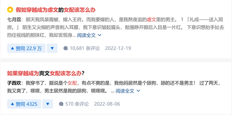 除此之外,《宫墙柳》的火爆也催生了更多网文的出现。知乎平台内,越来越多的用户尝试在一些开放话题下进行故事连载。比如“如果穿越成为虐文的女配该怎么办?”“当霸道总裁文里出现沙雕女主是一种怎样的体验?”“以…开头写个故事”……很多类似话题下都能看见创作者们的神奇脑洞,爆款短文由此频频出现,知乎网文生态也开始初具雏形。