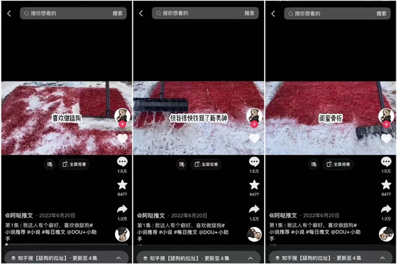 这类来自网络小说的经典语段,最近频频“现身”于抖音。卡思观察到,有不少账号通过画面配音的方式,将小说里的高潮情节制作成视频,吸引了大批用户的点赞关注。值得注意的是,这些视频有一个很大的共同点,即其中的很多桥段都出自知乎付费盐选会员里的内容。