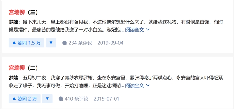 网友的喜爱也成为@梦娃 连载的动力,就这样《宫墙柳》在众多知乎网友的追随下逐渐成型,并在平台的推荐机制下,得到了极大的曝光。目前《宫墙柳》原回复帖的点赞已经达到45.3万,而“为什么后宫中嫔妃们一定要争宠”话题的浏览更是高达1.9亿。