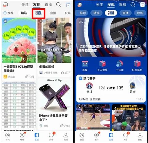 部分用户从这里进入后,还能看到显眼的“NBA”Tab标签,页面内聚合NBA赛事的短视频内容以及交流讨论区。