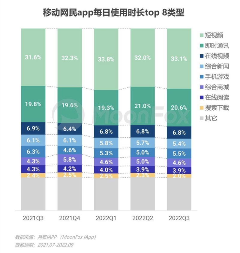 最新一期《中国互联网络发展状况统计报告》显示,我国短视频用户规模达9.62亿,占网民整体的91.5%。从用户规模上看,是即时通讯之外的第一大用户群体。同时,短视频也是我国网民使用时长最长的产品形态,最近几个季度稳定在33%左右,“断层式”高于即时通讯等产品。