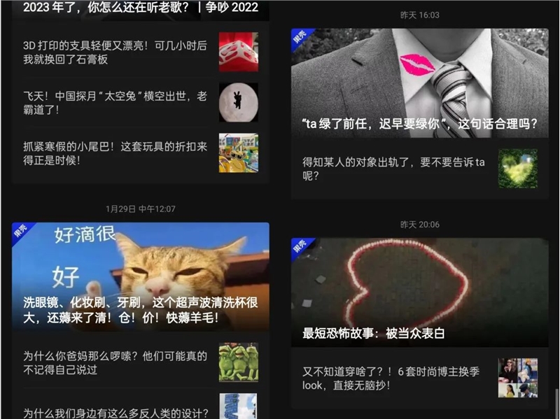 订阅号信息流的第二大重大变化是兴趣化。目前,公众号的时间顺序已经被完全打乱:刺猬公社发现,有时,公众号信息流中三天前发布的文章和十几个小时之前发布的文章紧挨着;常读的公众号,即使一天多次发布文章,用户刷几屏就会多次读到,不常读的公众号发布的文章,用户可能要下滑很久才会发现——原来我还关注了这么一个号。