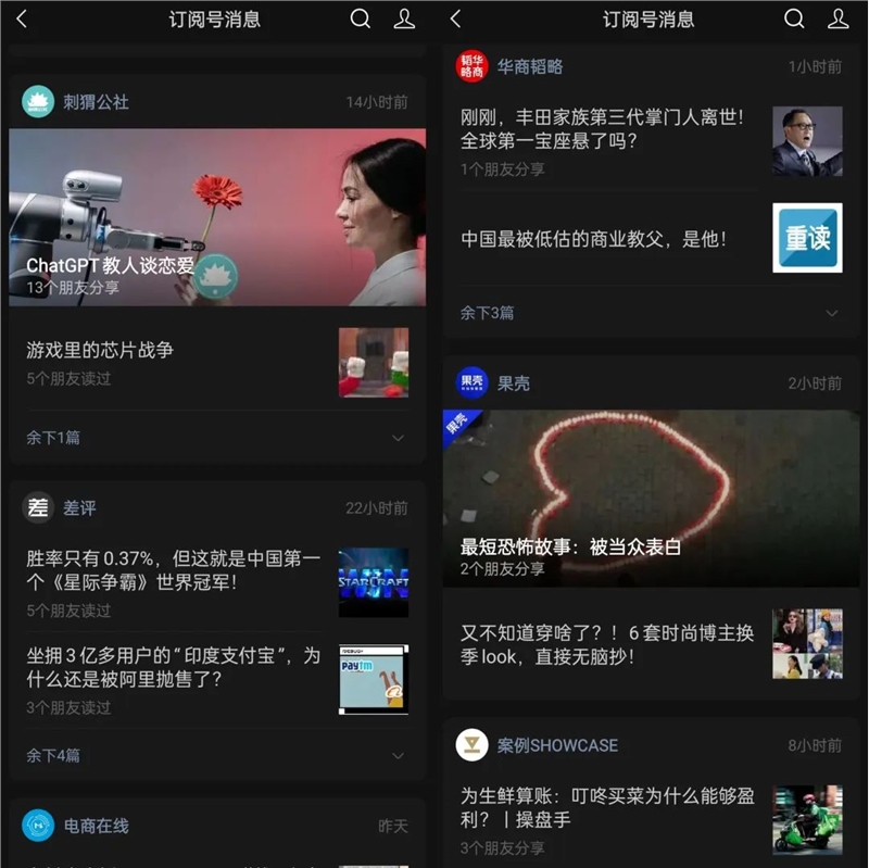 最后要说的是“公平”化。这是最近微信信息流发生的变化:不论是用户常读的还是不常读的,头图被折叠的还是不被折叠的,都“众生平等”,只能展示最多两条推送内容,剩余的推送内容被折叠,用户只能点击之后再查看。