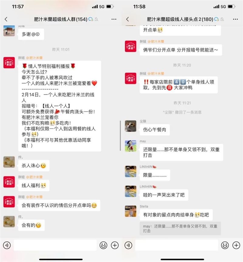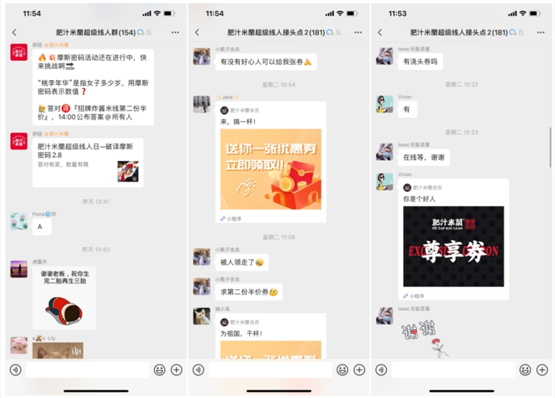 最后,社群的互动消息有问必答,这是整个社群运营中最重的部分。原则上,当公域(如大众点评,外卖双平台)上信息更新恰当且产品不出现重大问题时,不会有过多问题在群内提问。如果这类问题出现了,可以促进其他部门优化展示信息。毕竟私域不是客服,不要让用户养成因为“懒惰”而提问的习惯,比如可以回复“营业时间可以关注门店大众点评”,“菜品是否售完可以电询门店”等。