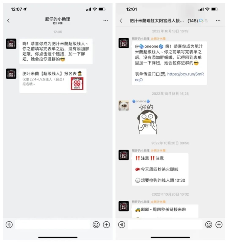 肥汁米蘭的社群不是天生的“去运营化”,冷启动阶段仍然是重人力交付的,在社群搭建之前品牌需要做的是集合同一类人,并且让他们和同属一类的运营伙伴在群内简单交流。既交付了需求,也交付了人情。