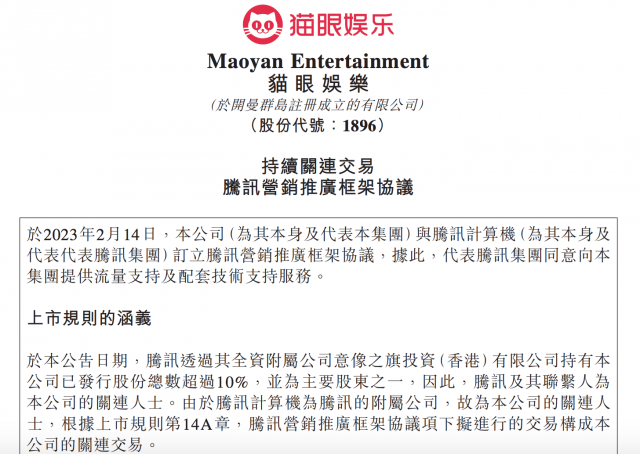 2月15日消息,昨日,猫眼娱乐在港交所发布公告称,于2023年2月14日,公司(为其本身及代表集团)与腾讯计算机(为其本身及代表腾讯集团)订立腾讯营销推广框架协议,据此,代表腾讯集团同意向集团提供流量支持及配套技术支持服务。