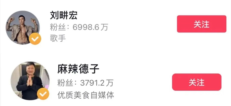 他们涉及的类别也很广,包含生活、音乐、美妆、母婴亲子等15大垂类,如粉丝近7000W的“刘畊宏”是健身类,粉丝超3700W的“麻辣德子”是美食类;