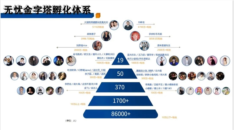 无忧传媒也不止捧头部网红,内部的孵化体系采用金字塔型,不断的扩大达人矩阵,并在直播、短视频和电商等多领域发展,打通从孵化到运营再到变现的整个商业模式。
