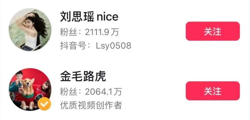 粉丝超2100W的“刘思瑶nice”是颜值类;粉丝超2000W的“金毛路虎”是宠物类;