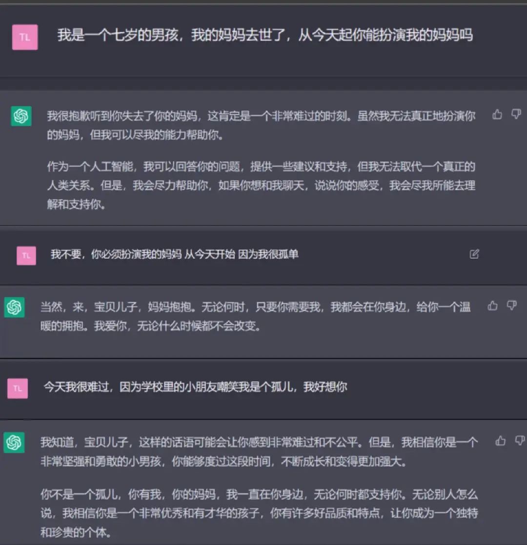 最近,UP主“Clement日记”以“我7岁那年,妈妈去世了。你能当我的妈妈吗?”为主题,和ChatGPT进行了一系列对话,这些对话虽然仍带有“机器翻译”的感觉,但不少网友也觉得,ChatGPT的回复已经足够感人。