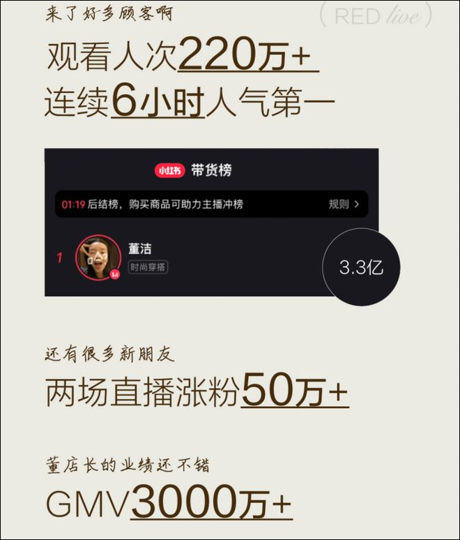但从战绩上看,董洁的带货表现十分亮眼——据小红书商城公开的数据显示,董洁1月13日和2月24日两场直播GMV分别达到了5000万+和3000万+,人均观看时长约6分钟,一度冲上小红书带货榜榜首。