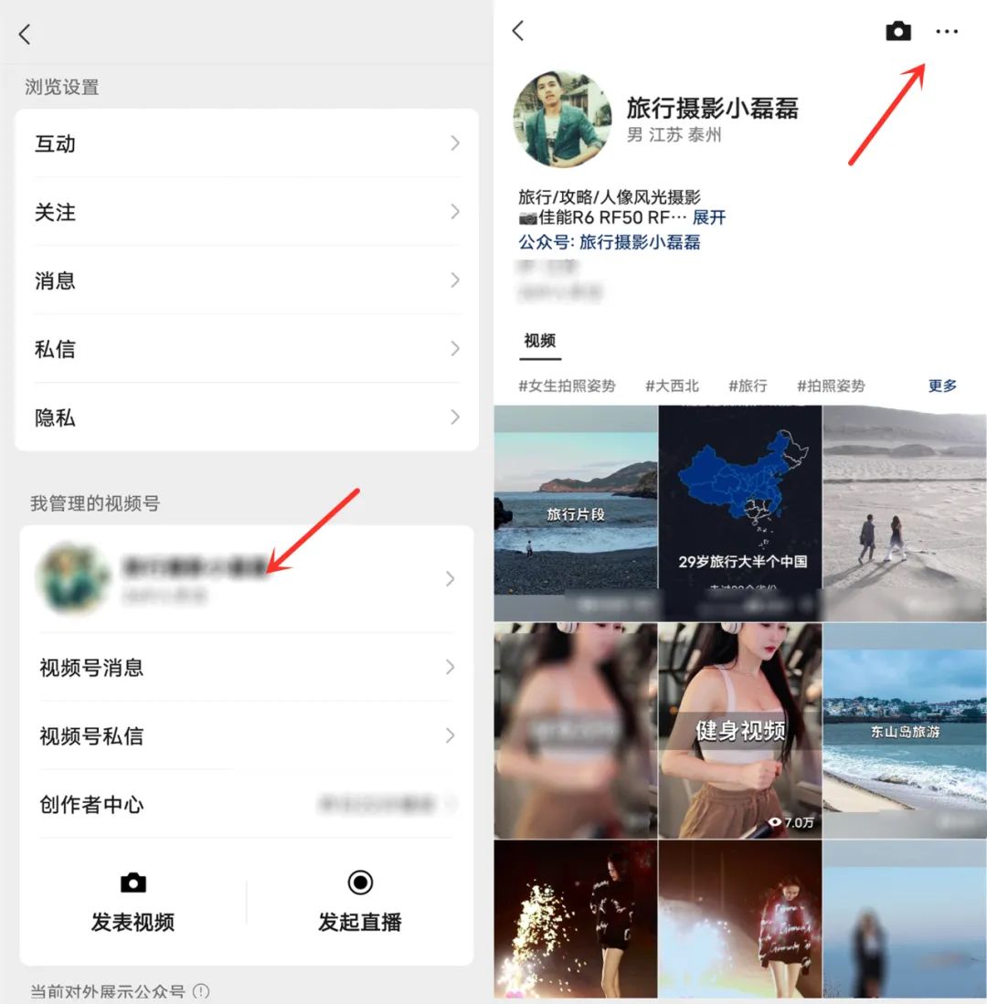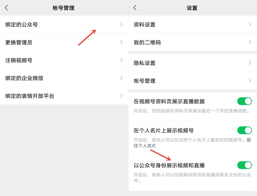 操作很简单,打开个人微信,进入视频号,戳名称,点击“···”,绑定公众号,以公众号身份展示视频和直播。