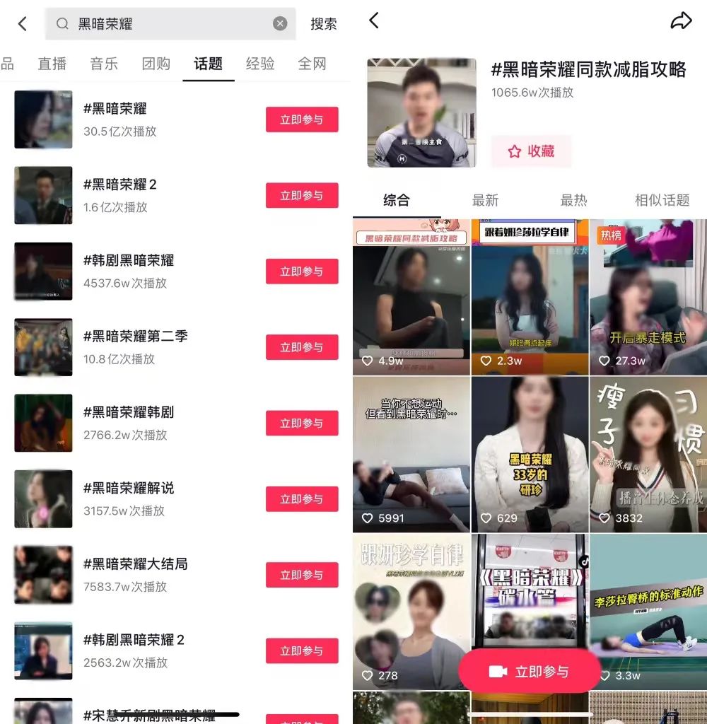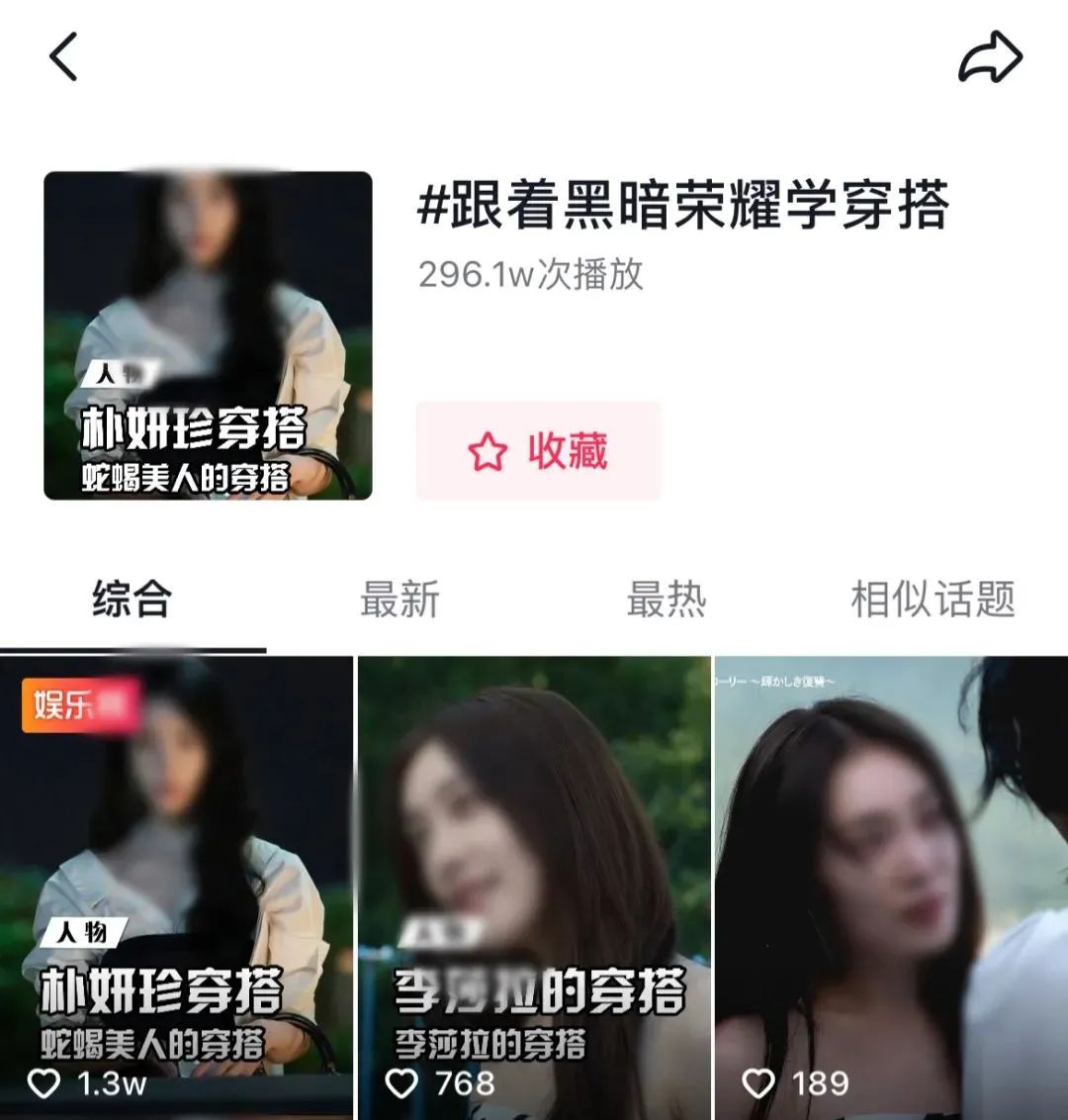在抖音上搜索“黑暗荣耀”,可以发现平台上的热门内容包括剧情解说、同款穿搭、仿妆,甚至减脂健身赛道的博主也参与其中。