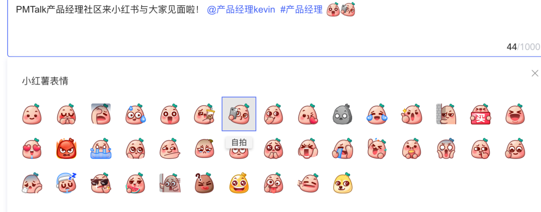 在网页编辑器里支持话题、用户名称、表情包搜索,通过勾选话题、用户名称即可定位到对应的内容完成输入,目前还没有推荐话题、推荐关注人员,相信后期运营投入后,会在这方面做上文章,如下图。
