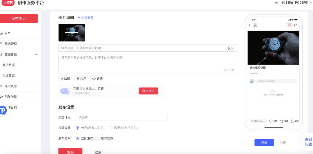 进入小红书上发布笔记,就可以看到笔记创作页面,左边是笔记的标题和详情输入,右边是小红书笔记的预览,目前小红书笔记预览还是有一些小BUG,比如头像展示是缺失的,还不支持互动。