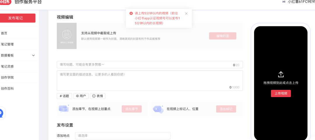 现在小红书创作仅支持5分钟以内的笔记,认证通过后可以发布15分钟的笔记